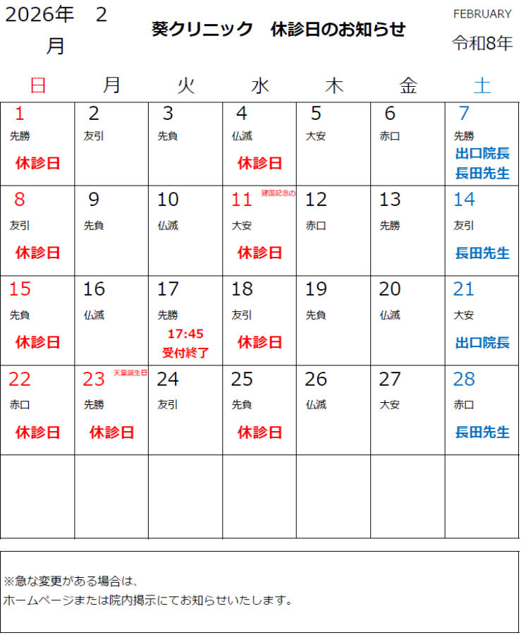 2026年2月17日火曜日午後の診療時間につきまして都合により、